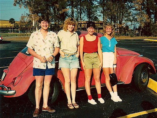 Here we are on spring break from college in 1985 with some excellent examples. Joel is wearing Docksiders and some weird printed shirt. Lauren is displaying the Perm, which was an essential hair element for men and women alike. Suzie and I have classic footwear: the white tennie with bobby socks. Sweet.